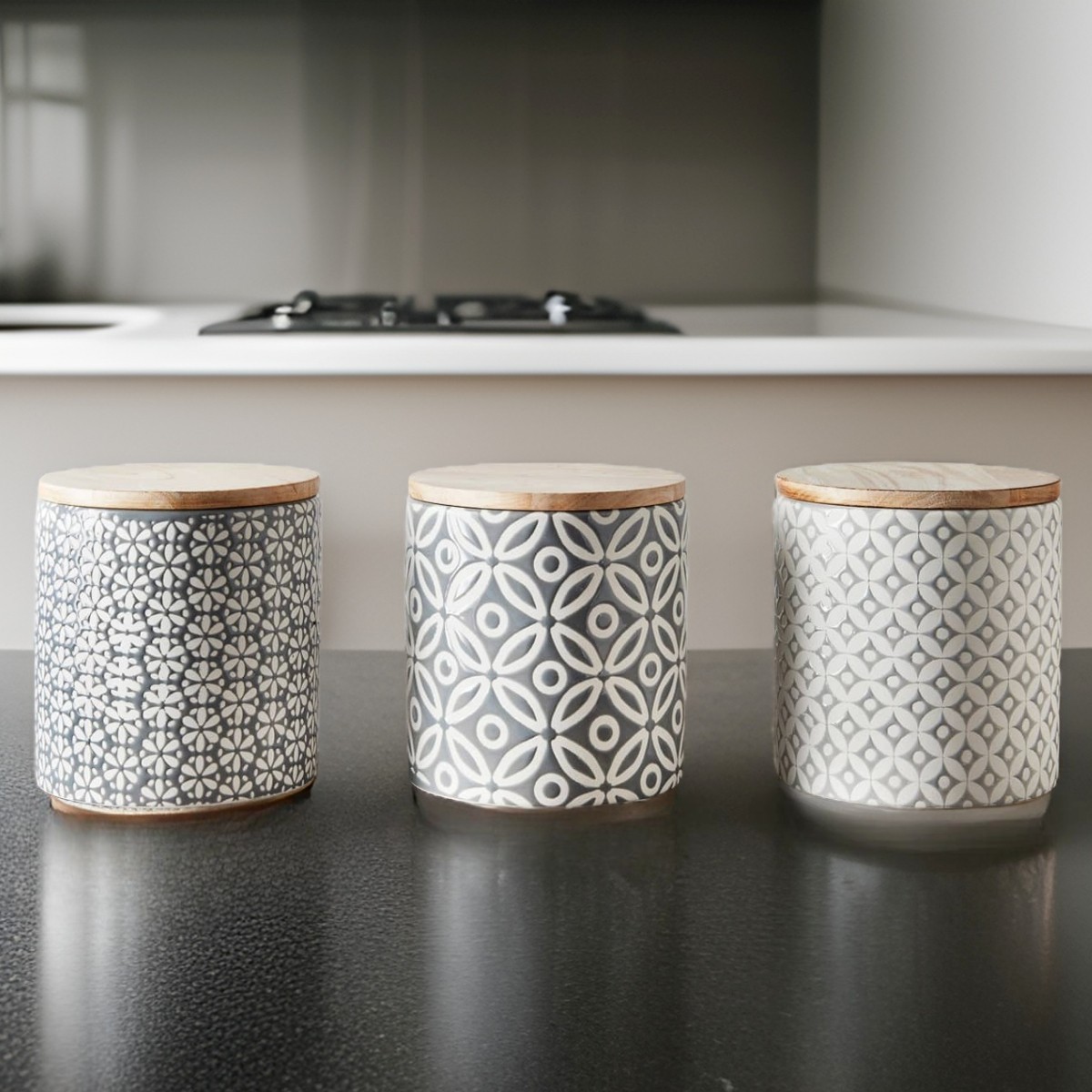 Set Of 3 Ceramic Tea Coffee Sugar Canisters Jars Geo Embossed Storage Jars Pots