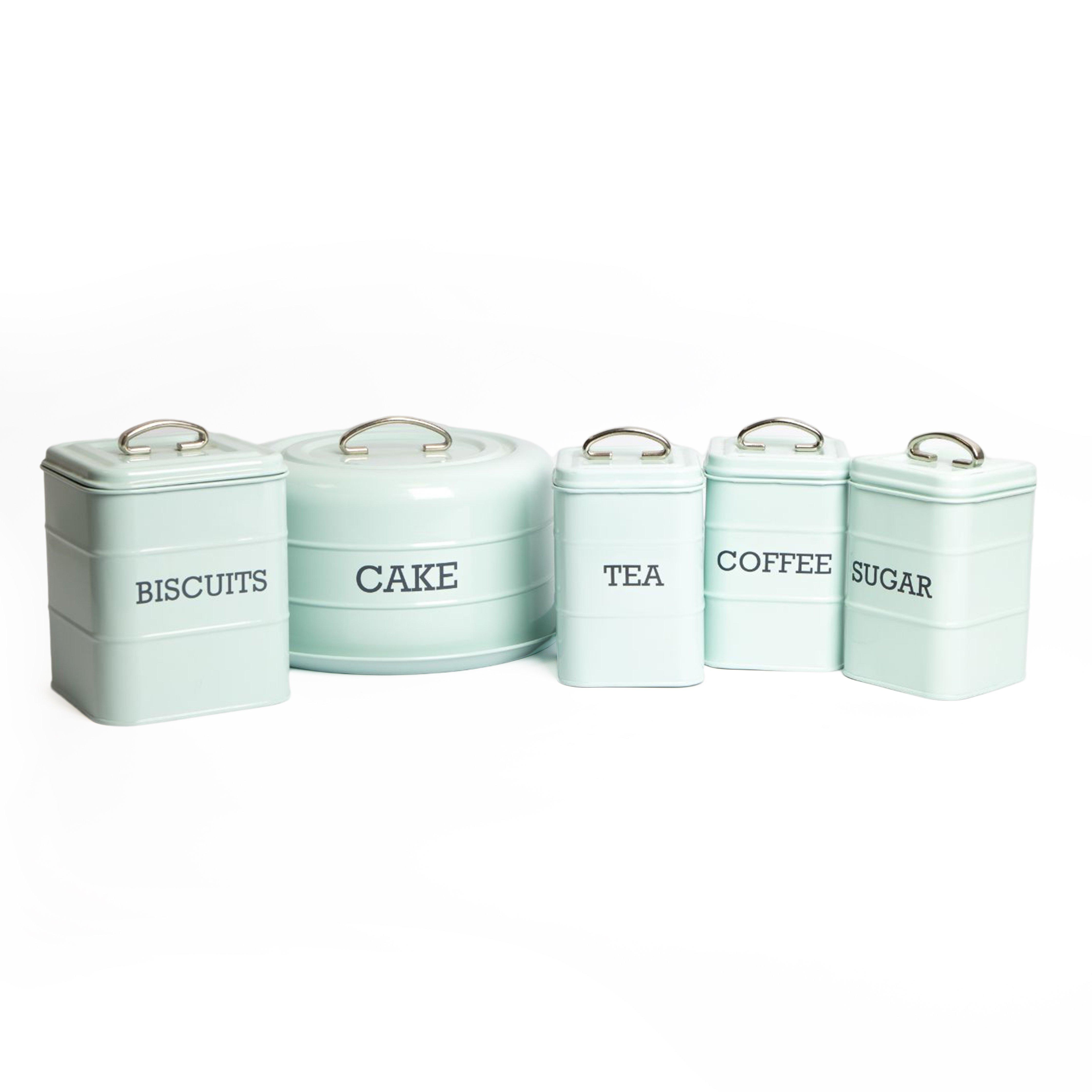 5pc Kitchen Storage Tin Set with Tea, Coffee & Sugar Canisters, Biscuit Tin and Domed Cake Tin