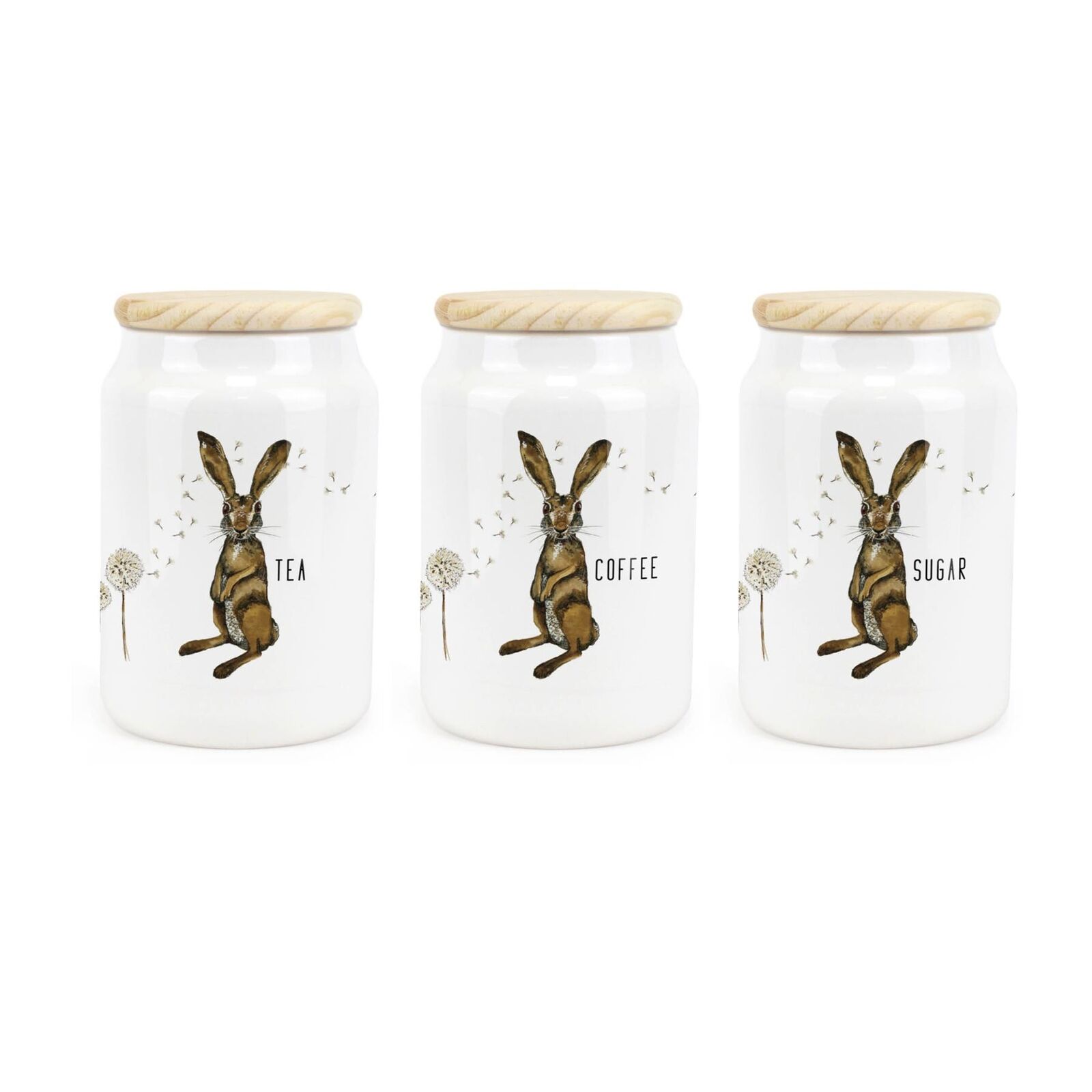 Ceramic Tapered Hares & Dandelions Canisters - Tea, Coffee & Sugar Storage Pots