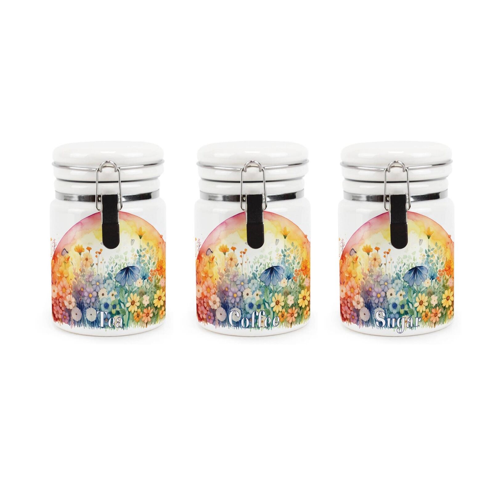 Ceramic Clip-Lid Floral Sunrise Canisters - Tea, Coffee & Sugar Storage Jars