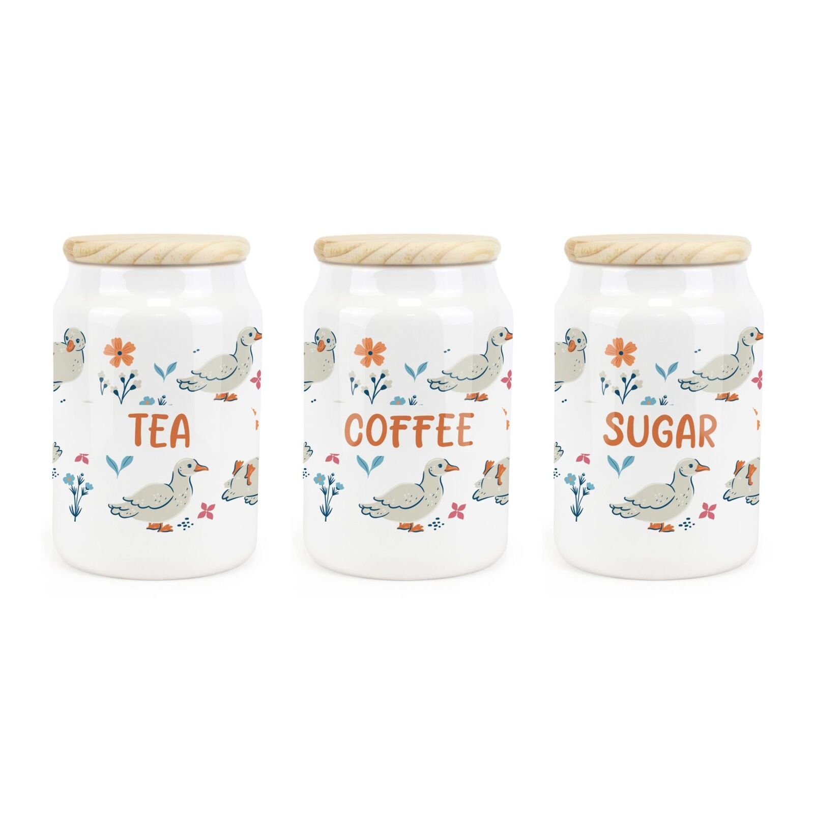 Ceramic Tapered Ducks & Flowers Canisters - Tea, Coffee & Sugar Containers