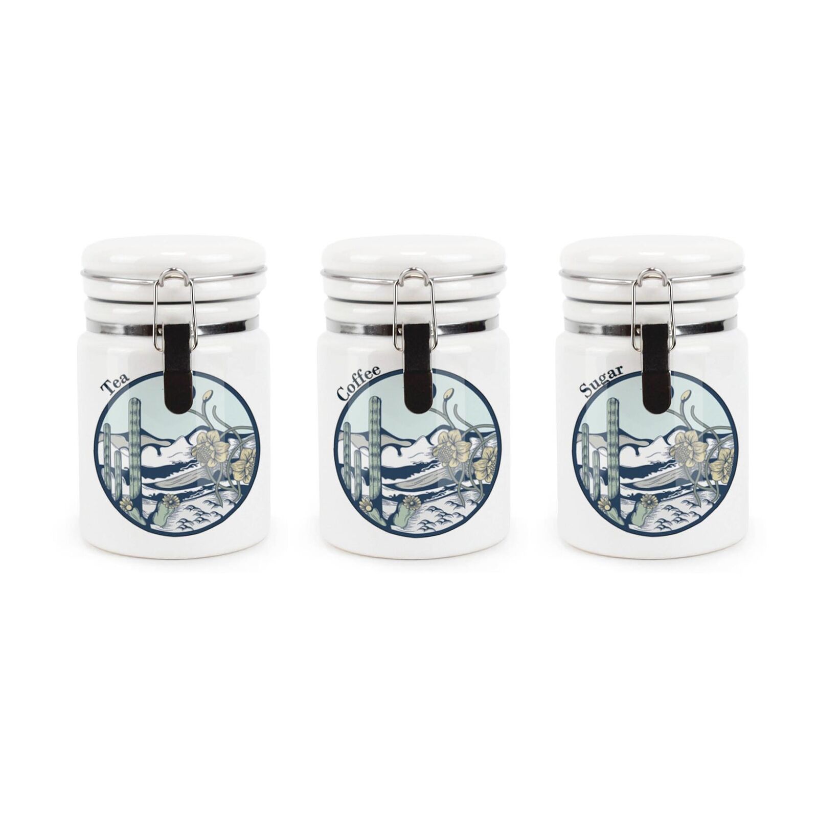 Ceramic Clip-Lid Desert Flowers Canisters - Tea, Coffee & Sugar Containers
