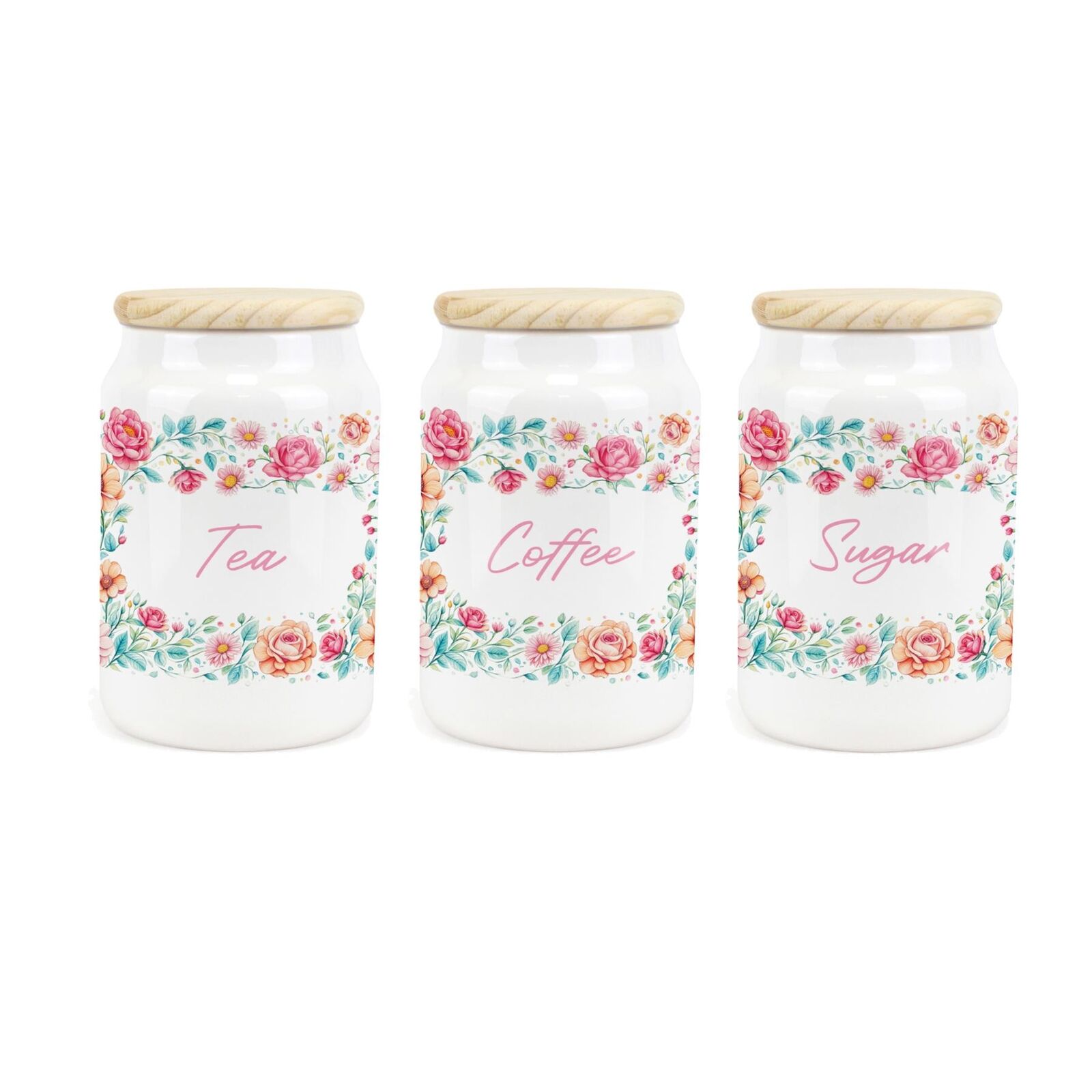 Ceramic Tapered Flower Border Canisters - Floral Tea, Coffee & Sugar Storage