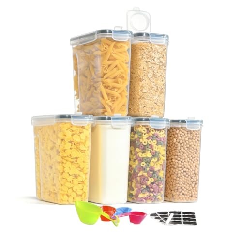 Skroam Cereal Containers Storage of 6 [4L/135.2 oz], Airtight Food Storage Containers with Lids, Plastic Cereal Dispensers for Kitchen & Pantry Organizers and Storage, Measuring Cup & 20 Labels