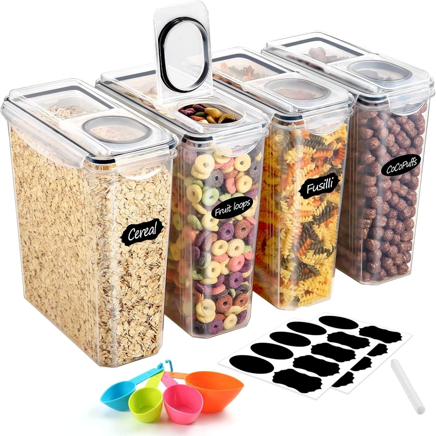 YASHE Cereal Storage Containers, 4Pcs Plastic Food Storage Containers with Lids Airtight, Durable Food Grade BPA-Free Cereal Containers with 16 Labels & 1 Marker