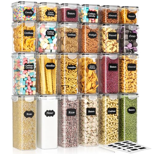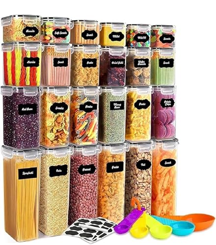 stusgo 24 Pack Airtight Food Storage Containers with Lids, Plastic Kitchen and Organization Canisters for Cereal, Flour and Sugar, BPA Free, Includes Spoons, Labels and a Pen
