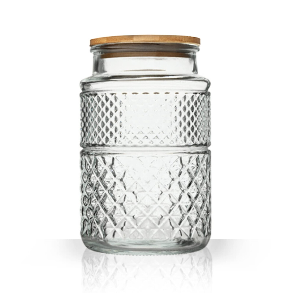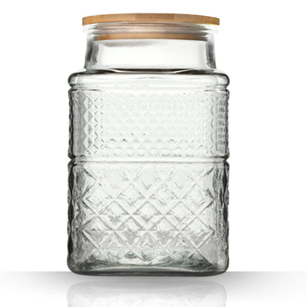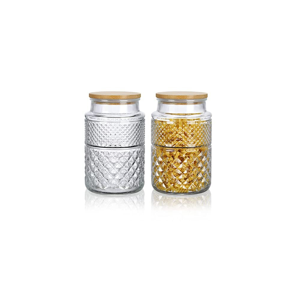 2L Glass Storage Jars with Bamboo Lid - Textured Large Glass Canisters Set of 2 - Airtight Kitchen Containers for Spaghetti, Cereal, Cookie, Flour,