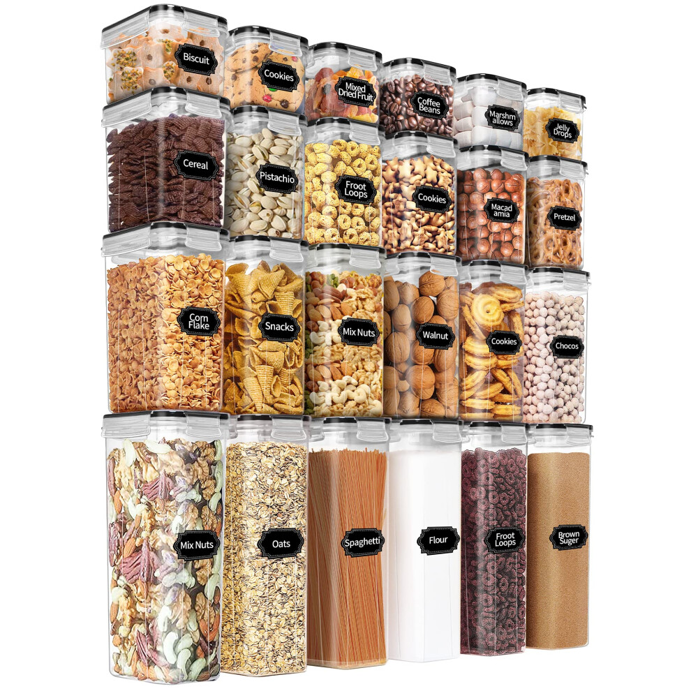 (Black-24pcs) Airtight Food Storage Containers, Food Canisters Organizer Marker for Cereal Flour Sugar Dry Food in Kitchen Pantry Cabinet Organization