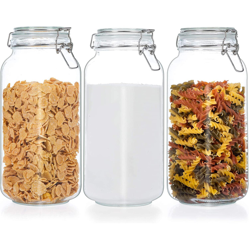 78oz Glass Food Storage Jars with Airtight Clamp Lids, 3 Pack Large Kitchen Canisters for Flour, Cereal, Coffee, Pasta and Canning, Square Mason Jars