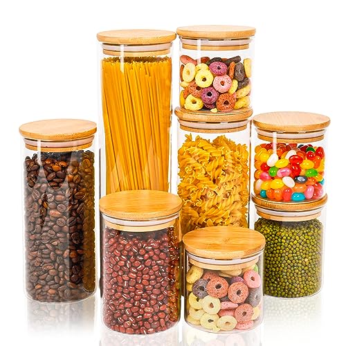 Otoomenz Glass Storage Jars With Bamboo Lids Set of 8, Airtight Glass Jars With Lids Clear Food Storage Container Jar- Food Kitchen Canisters Sets for Spaghetti Beans Snack Flour Cereal Storage