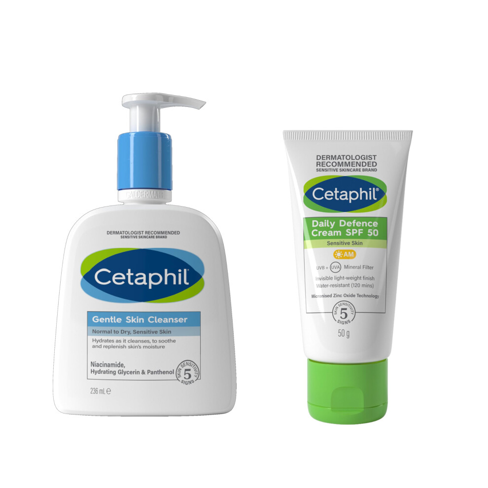 Cetaphil Sensitive Skin Daily Essentials Skincare Set, Gentle Skin Cleanser 236ml + SPF 50 Face Cream 50g, For All Skin Type
