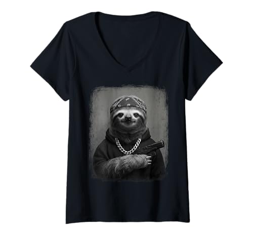 Women's Street Style Sloth Gangster Bandana & Chain Funny V-Neck T-Shirt