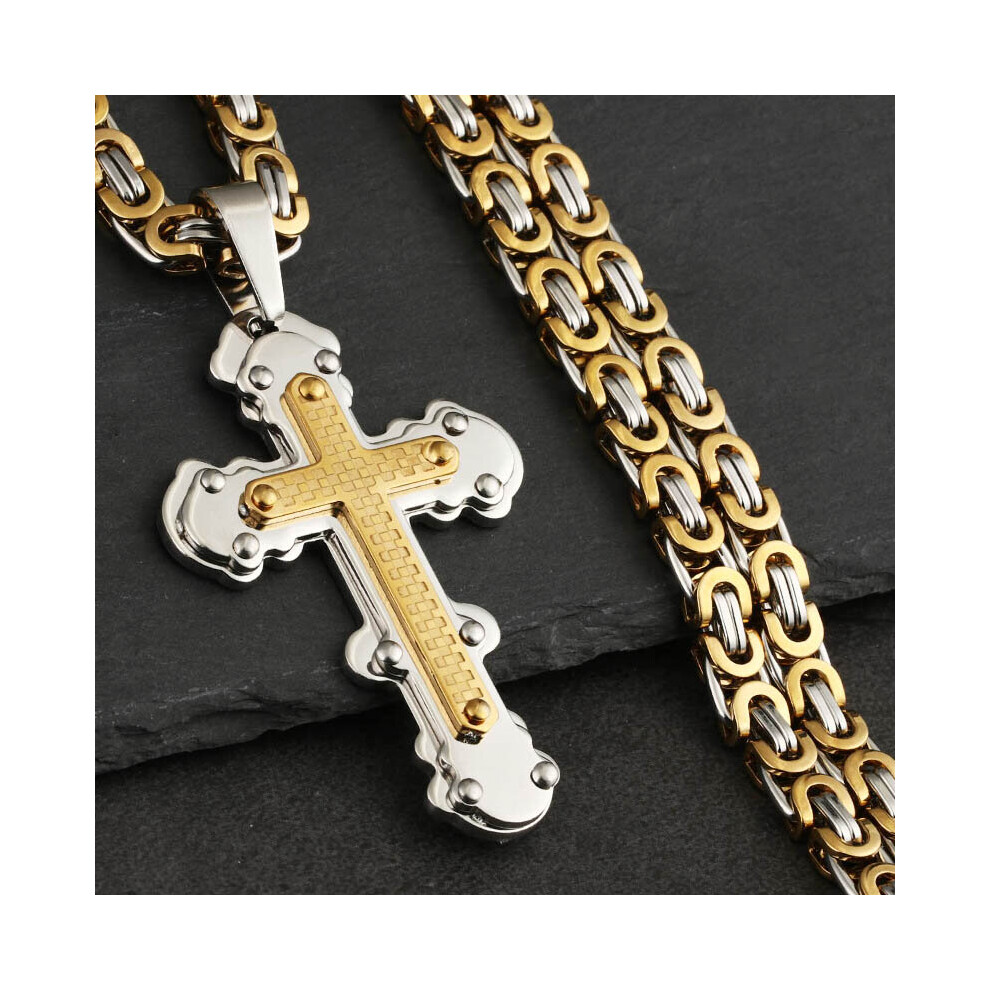 (Light Yellow Gold Color, 55cm) Orthodox Cross Pendant Necklaces for Men Stainless Steel Catholic Jesus Necklace Silver Byzantine Chains Male Jewelry