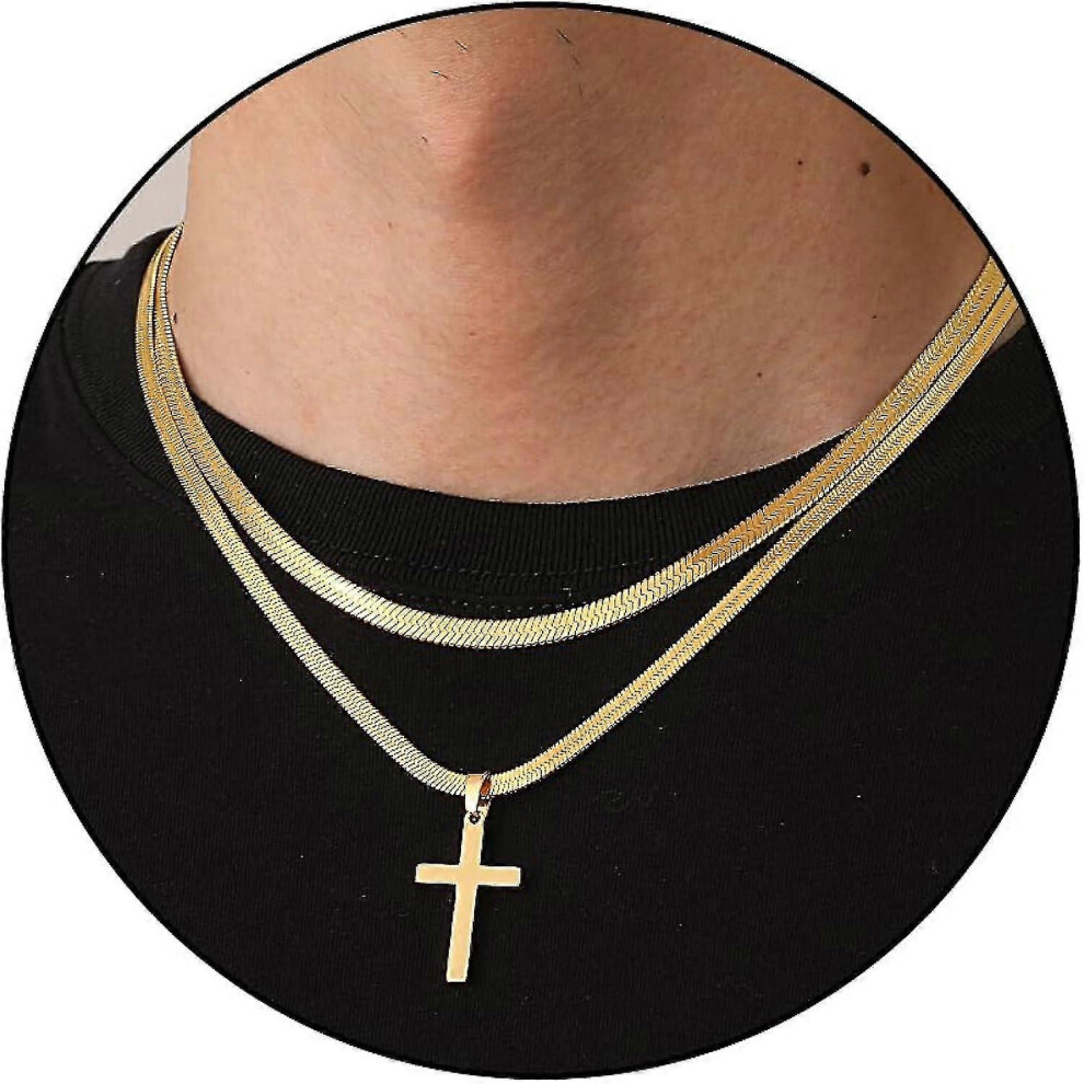 (18-20 Inch, Gold) Cross Necklace For Men Boys Women Stainless Steel Layered Herringbone Chain Cross Pendant 4mm/5mm Double Chains Christian Religious