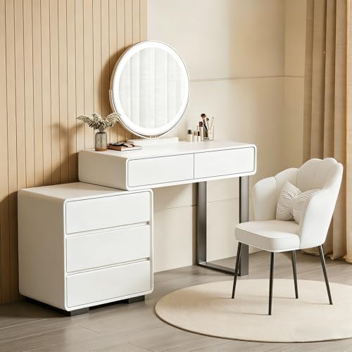 toilmua Dressing Table with Mirror & Light, 3 LED Light Modes Makeup Table with Sliding Mirror and Chair Vanity Desk - Modern Vanity Table for Bedroom 5 Drawers 4 Open Shelves