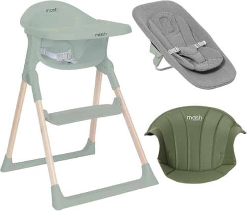 Mash High Chair Bundle by Baby Elegance | Includes Newborn Seat (0-6 Months), Toddler Seat (6+ Months) & Sage Cushion | Adjustable Sage High Chair for Babies & Toddlers