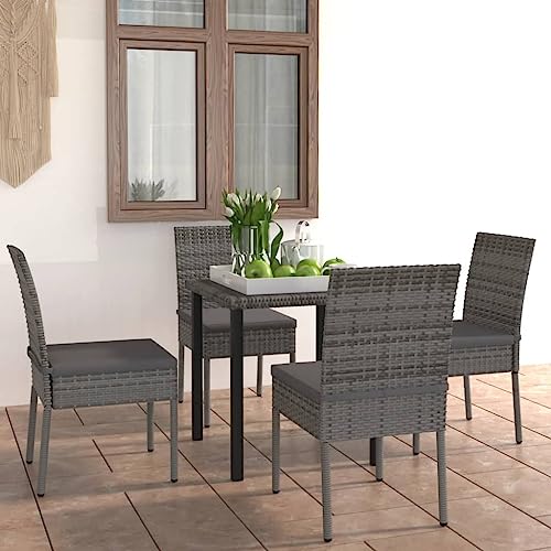 Qnhdfrt 5 Piece Grey Outdoor Dining Set, Poly Rattan Garden Furniture with Cushions, 70 x 70 cm Glass Table and 4 Chairs, Steel Frame, Conservatory or Patio Balcony