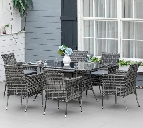 Rattan Dining Set Large Garden Grey Furniture Glass Rectangular Patio Table 6 Seater Wicker Chairs Outdoor Modern Conservatory Metal Frame Cushion Armchairs Seat,150x80x74,HS861-071V70GY