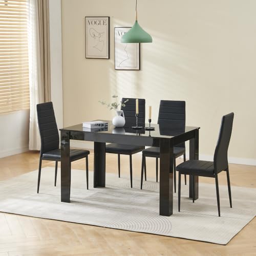 Panana 5Pcs Modern Dining Room Set, Glass Dining Table and 4 Upholstered Chairs, Elegant Home Kitchen Furniture Set (with Black Chairs, 120cm Black table)
