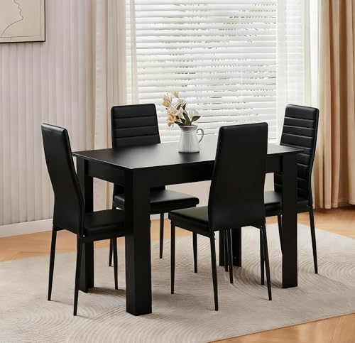 Menaka Modern Wooden Dining Room Table and Chairs Set of 4 for Small Space, 5 Pieces Rectangular Kitchen Table with 4 Chairs (110cm black table and 4 black leather chairs#1)