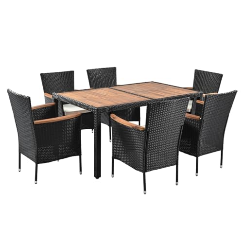 LoogCape 7-Piece Garden Dining Set Black Poly Rattan, Adjustable Chairs with Cushions, Acacia Wood Table, UV-Resistant for Patio, Balcony, Outdoor Living Area