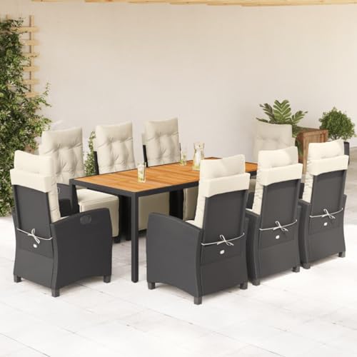 Yunovire 9-TLG. Garden Bistro Set, Black Poly Rattan, Adjustable Chairs with Cushion, Acacia Wood Table, UV Resistant, for Balcony, Terrace and Outdoor, Durable Exterior Furniture Set