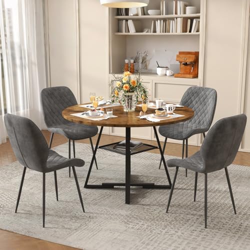 GOLDFAN Dining Room Set with 120cm Round Table and 4 Comfortable Velvet Chairs, Large Wooden Table with Chair for 4-6 People