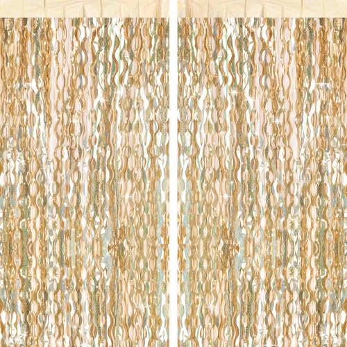 G2PLUS Wavy Glitter Champagne Gold Foil Curtains, 2PCS Metallic Tinsel Foil Fringe Curtains, 1m×2m Wave Tinsel Curtain Streamers, Party Backdrop Foil Curtain for Birthday Wedding Prom Decoration