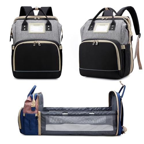AZOOKEN Nappy Changing Backpack, Waterproof Multi-Function Large Capacity Diaper Baby Travel Bag with Bed 3 in 1 Foldable Crib Unisex for Mom and Dad(Black)