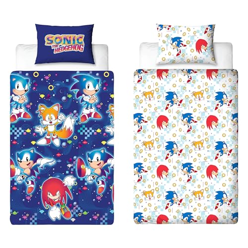 Character World Sonic The Hedgehog Official Single Duvet Cover Set | Liquid Design Reversible 2 Sided Bedding Including Matching Pillow Case | Gaming Single Bed Set Blue with Tails and Knuckles