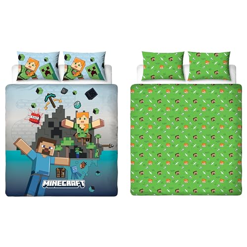 Minecraft Character World Official Movie Double Duvet Cover Set | Reversible Level Design Duvet Cover Set 2 Sided Includes Matching Pillowcases | Double Set
