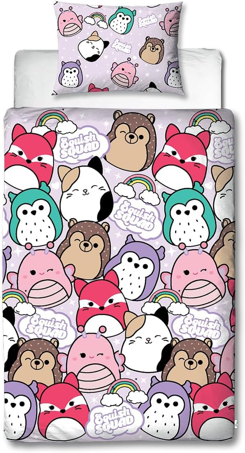 Squishmallows Character World Official Polyester Single Duvet Cover Set, Bright Design | Reversible 2 Sided Squish Squad Bedding Cover Official Merchandise Including Matching Pillow Case, Multicolor