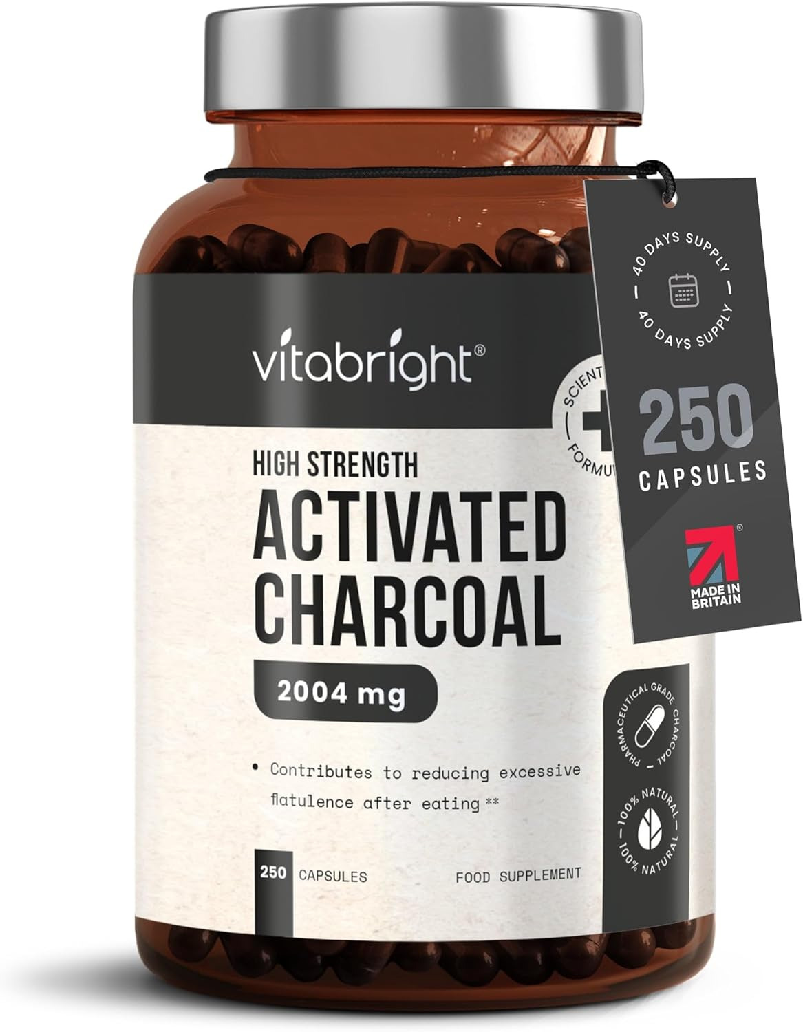 VitaBright Activated Charcoal Tablets for Stomach Wind | 2004mg | 250 Capsules