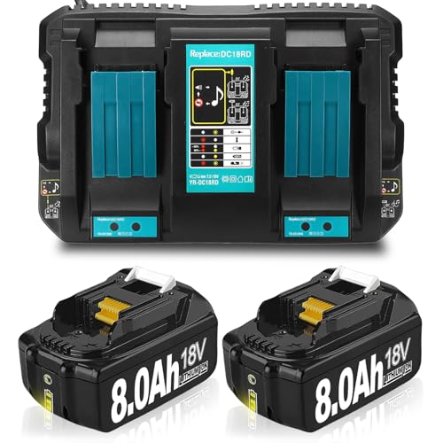 2Pack 8.0Ah 18V BL186 Replacemnet for Makita Battery with DC18RD Charger Compatible with Makita Battery BL1860 BL1860B BL1850 BL1840 BL1830 DC18RA DC18RC DC18RD (2Battery+1Charger)