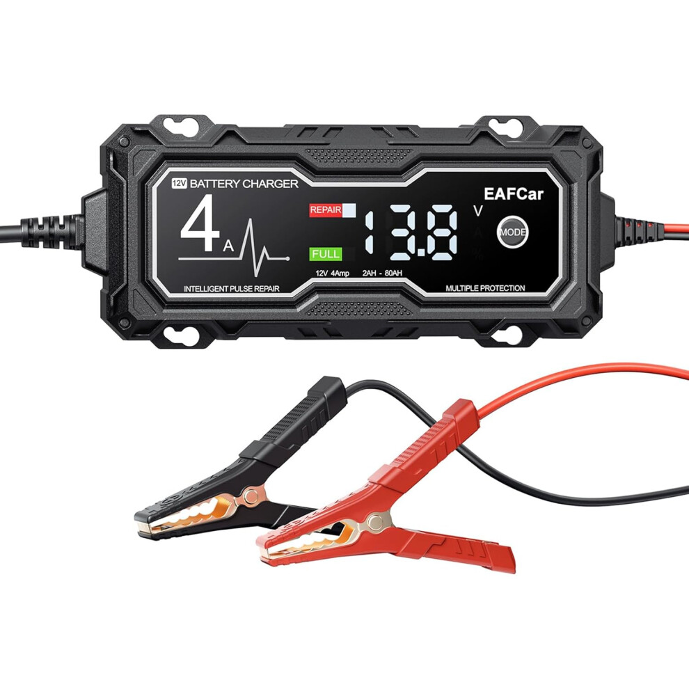 EAFCar 4Amp 12V Car Battery Charger, Trickle Charger for Car, Motorcycle, Boat, Mower Battery with Intelligent Charging, Repairs, Maintains Lead Acid Batteries