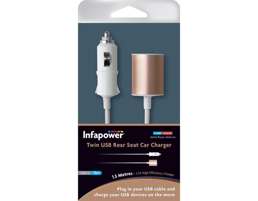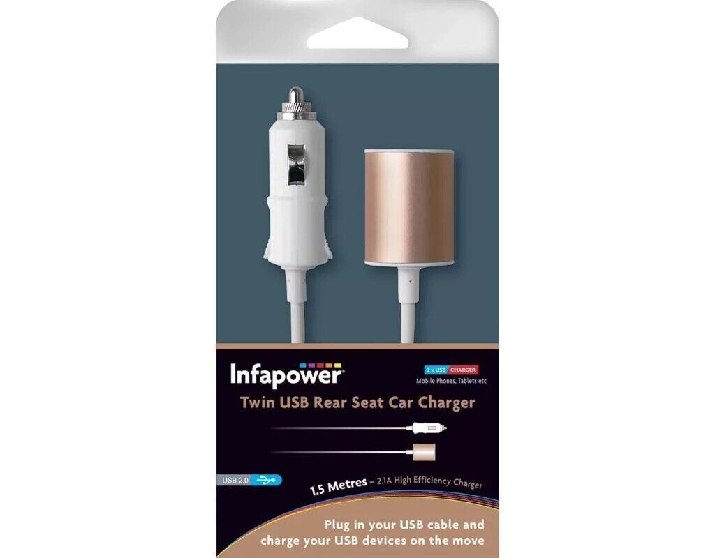 Infapower Twin USB Fast Rear Seat Car Charger For Mobile Phones Gadget 1.5M Wire