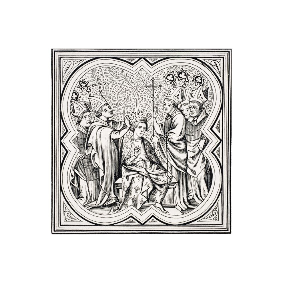 Coronation of Charlemagne - Facsimile of A Miniature In The Chroniques De Saint-Denis Manuscript of The Fourteenth Century Poster Print, 14 x 14