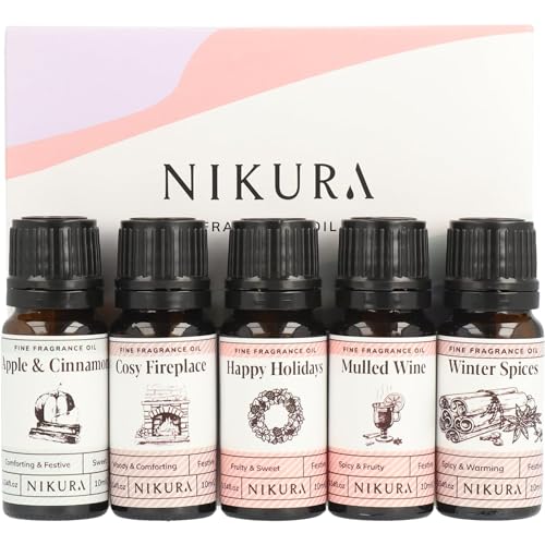 Nikura Winter Cosy Night in Fine Fragrance Oil Gift Set - 5 x 10ml | Great for Diffusers for Home, Soap & Candle Making, Wax Melts, Burner | Bath Bombs, Perfume Scents | UK Made Essential Oils