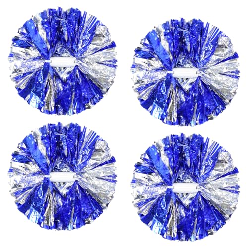 CREATIEE-PRO 4Pcs Metallic Cheerleading Cheerleader Pom Poms, 1 Pair Cheering Squad Pompoms for Kids Boy Girl School Sports Games Team Spirit Cheer Ball Dance Party(11 Inches) (Blue-Silver)