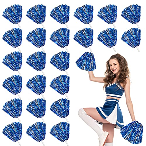 LINYAPRY 24 Pcs Metallic Cheerleading Pom Poms for Kids, Cheerleaders Cheer Pom Poms with Baton Handle, Cheering Squad Hand Flower for Adults Team Spirit Sports Game Dancing Party (Blue)