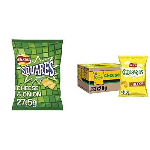 Walkers Crisps Squares Cheese and Onion Snacks Box, 27.5 g (Case of 32) (Packaging may vary) & Crisps Quavers Cheese Snacks Box, 20 g (Case of 32)