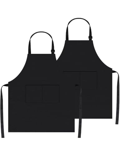 Jubatus 2 Pack 3 Pockets 100% Cotton Adjustable Bib Apron Chef Kitchen Cooking Aprons for Women Men, Black