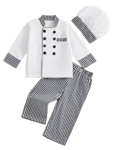 Anuedgis Unisex Toddler Chef Outfit Classic Long Sleeve Button Down Tops Matching Plaid Trousers with Hat Kids Baker Costume (A-White, 2-3 Years)