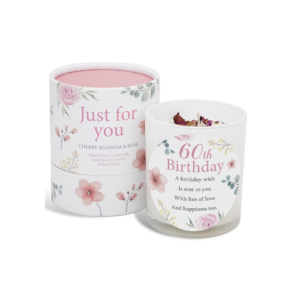 60th Birthday Soya Candle with Rose Quartz & Rose Petals - Gift Box, 8oz, 40h, Cherry Blossom & Rose Scent (Model CANDLE09-60TH)