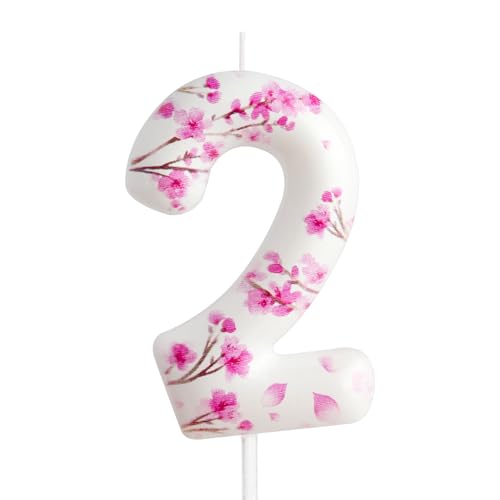 2nd Birthday Candle Cherry Blossom Number 2 Candle Cherry Blossom Cake Decoration Birthday Party Supplies White Pink Sakura Themed Cake Topper Decoration for Kids Boy Girl Party Decor Supplies