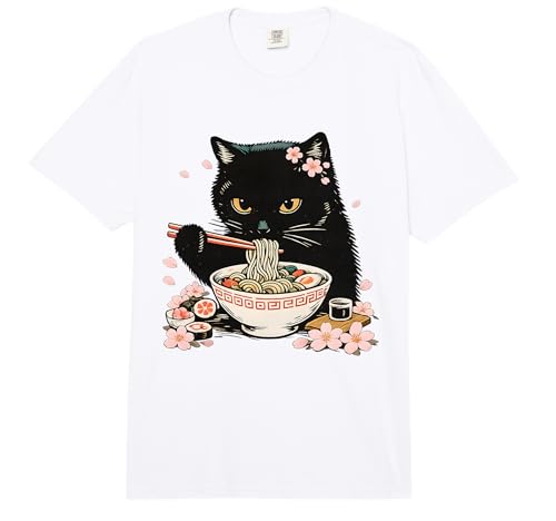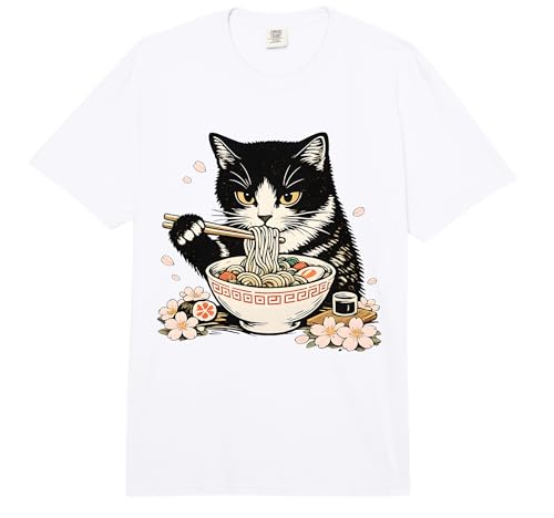 Tuxedo Cat Eating Ramen Noodles Japanese Cherry Blossom Cat Comfort Colors Adult Heavyweight T-Shirt