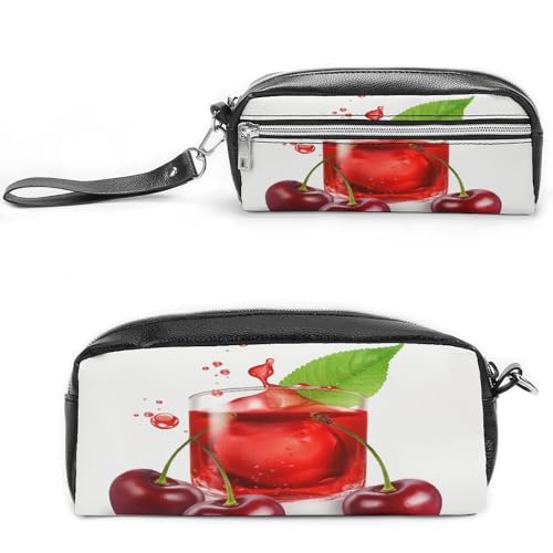 POTSCBVW Cherry Juice Pencil Case Large Capacity with Two Compartments, Zipper Leather Pencil Pouch, Portable Travel Cosmetic Bag for Women Men