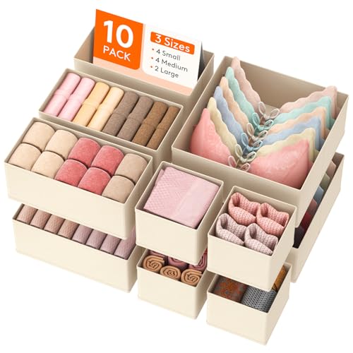 Lifewit 10 Pack Drawer Organiser, Collapisble Fabric Chest of Draw Dividers for Closet, Dresser, Nursery, Bedroom, Foldable Cube Boxes for Clothes, Pants, Underwear, Sock, Bras Organization, Khaki