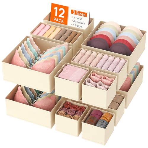 Lifewit 12 Pack Drawer Organiser, Collapisble Fabric Chest of Draw Dividers for Closet, Dresser, Nursery, Bedroom, Foldable Cube Boxes for Clothes, Pants, Underwear, Sock, Bras Organization, Khaki
