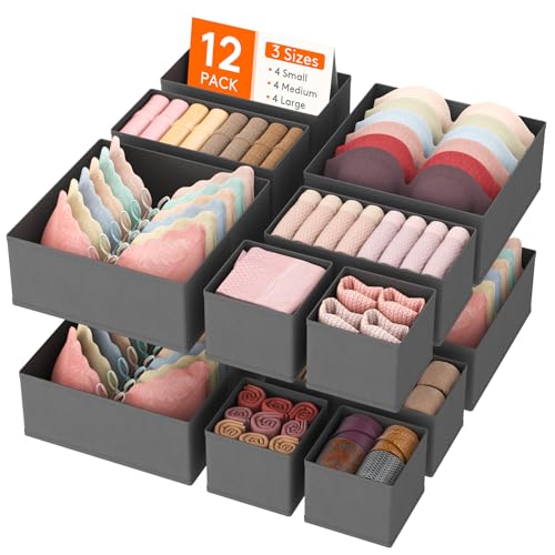 Lifewit 12 Pack Drawer Organiser, Collapisble Fabric Chest of Draw Dividers for Closet, Dresser, Nursery, Bedroom, Foldable Cube Boxes for Clothes, Pants, Underwear, Sock, Bras Organization, Grey